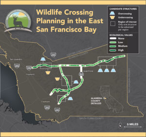 Every year, wildlife in the East Bay attempt to cross busy highways like I-580, I-680, and CA-84, roads that divide natural habitats and create dangerous barriers for animals and people alike. Collisions can be deadly, contribute to declining wildlife populations, and pose a serious public safety risk. These challenges are intensified by climate change, which forces animals to move in response to wildfires, drought, and floods in the short term, and long-term shifts in climate and habitat over time. As development expands and conditions continue to change, safe passageways are becoming more important than ever.